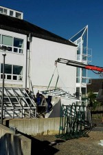 Aktuell ist der Wintergarten im Rathaus-Foyer an der Kreuzweidenstraße in Arbeit und wird derzeit unter Federführung des Fachdienstes Technisches Gebäudemanagement der Stadt Bad Honnef von Grund auf erneuert: Die alte Stahl-Glas-Konstruktion ist zurückgebaut. Derzeit werden die Aluprofile errichtet, so dass sich das zukünftige Aussehen des Bereichs schon erahnen lässt. Nach der Energieeinsparverordnung (EnEV) wird eine thermische Trennung erreicht. Das bedeutet, dass Wärme- oder Kältebücken zwischen zwei Bereichen mit unterschiedlichen Temperaturen - hier also außen und innen - vermieden werden. Die ersten Glasscheiben sind schon eingesetzt. Sie haben eine spezielle Metallbedampfung, um das Aufheizen im Sommer zu verringern. Neben der Anpassung an die aktuellen energetischen Standards wird die Regenwasserableitung von den Dachflächen aus dem Gebäude geführt.