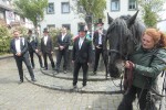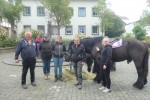 Der dortige Wirt Christian Eisele war auf Bestreben des Bürgervereins aktiv geworden und hatte einen Imbiss vorbereitet, der zusammen mit etwas Alkohol genüsslich verzehrt wurde. So konnte wiederum die ehemals getroffene Vereinbarung, allerdings in eher spartanischer Weise, auch diesmal wieder erfüllt werden. Wenn es auch nur eine leckere Bratwurst mit Bier und anderen Alkoholika waren, die gereicht wurden, so hatten die Heddesdorfer Pfingstreiter doch mit ihrem „Chef“ David Jacoby und den übrigen Reitern Andreas Leufgen, Dietmar Gansen, Michael Gutfrucht , Maximilian Söhn und „Charly“ Kast sowie mit Pferdebesitzer Thomas Kurz, seiner Ehefrau und Tochter sowie weiteren „Pferdeflüsterinnen“ alle ihren Spaß und auch die geduldigen Pferde waren auf dem Engerser Marktplatz offenkundig zufrieden als sie Heu und Wasser erhielten.