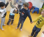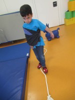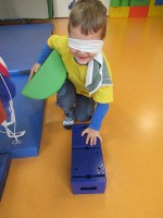 Dabei wurden die verschiedenen Knochen und ihre Begriffe erlernt, und die Kinder erfuhren so, welche Funktionen die einzelnen Knochen haben und wo sich diese jeweils befinden. Zum Schluss wurde ein „Kino“ veranstaltet wo sich die „SchuKis“ einen Film über den Körper in kindlicher Darstellung angeschaut haben. Einige Kinder erklärten auch, dass nicht jeder Mensch Arme oder Beine besitzt und beispielsweise ihren Mund als Hilfe benutzen, um zu schreiben. So entstand schließlich die Idee für das nächste Angebot. Die Kinder wollten unbedingt erfahren, wie es ist, ohne eines bestimmten Körperteils zu leben oder nicht sehen oder hören zu können. Dazu wurde im Turnraum ein Parcours aufgebaut, den die Kinder durchlaufen mussten. Jedes der Kinder hatte eine „Beeinträchtigung“ und es war nicht gerade einfach, den Parcours zu begehen. Für die „Blinden“ war es eine besondere Herausforderung, denn diese mussten sich ganz alleine auf ihre anderen Sinne verlassen, wie das Hören und Tasten.