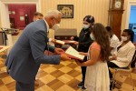 Im weiteren Verlauf seiner Rede erinnerte Hallerbach noch einmal daran, was die 19 Frauen, Männer und Kinder auch während des durchaus aufwendigen Einbürgerungsverfahrens mit auf den Weg bekommen haben: dass Offenheit und Respekt zwei unverzichtbare Bedingungen für das Zusammenleben in Deutschland sind. Und dass im Grundgesetz die Grundrechte verankert sind: von der unantastbaren Würde des Menschen über die Religions-, Meinungs- und Pressefreiheit bis hin zum Brief- und Postgeheimnis. Dazu, Grundgesetz und Gesetze der Bundesrepublik Deutschland zu achten und alles zu unterlassen, was ihr schaden könnte, bekannten sich die neuen Staatsbürger dann auch beim „feierlichen Bekenntnis“, das sie dem Landrat nachsprachen. Allein das sonst übliche gemeinsame Singen der Nationalhymne musste Corona-bedingt ausbleiben. Stattdessen untermalte mit Michael Steinebach ein Schüler der städtischen Musikschule die Veranstaltung musikalisch.