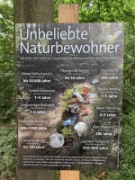 Ein weiteres neues Schild ist eine Tafel mit den visualisierten Ursachen der aktuellen Waldschäden. Diese Tafeln sind vereinzelt an infolge der Trockenheit und Borkenkäferkalamität entstandenen Kahlflächen im Wald angebracht worden, um den Waldbesuchern zu erklären, warum „an dieser Stelle gerade keine Bäume mehr stehen“ und was für die Wiederbewaldung getan wird.