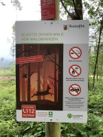 Zum anderen wurden Schilder mit Vorsichtsmaßnahmen zum Schutz vor Waldbränden angebracht, da in den letzten Jahren lang anhaltende Trockenphasen immer häufiger auftreten. Da reicht oft eine weggeworfene Zigarettenkippe oder eine Glasflasche, um für den Wald das Schlimmste zu verursachen. Rauchen und Feuermachen sind im Wald ohnehin ganzjährig verboten!
