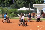 Mit Interesse verfolgten die Besucher das Training, durchgeführt von Jürgen Kugler und Anna Pracht (beide Rollitennis e.V.) und schon nach kurzer Zeit waren alle verfügbaren Sportrollstühle im Einsatz, denn jeder wollte ausprobieren wie anders das Tennisspiel ist, wenn man nicht auf den eigenen Füßen steht.