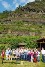Bereits am Nachmittag hatten die jüngsten Gäste Spaß auf einer Hüpfburg und bei Spielen unter Leitung des Teams der Ferienfreizeit. Unterdessen starteten die Erwachsenen zu einer kleinen Wanderung durch die Unkeler Weinberge. An drei Stationen konnten sie heimischen Wein verkosten. Die Unkeler Winzer Jörg Belz und Bruno Krupp berichteten über den heutigen Weinbau in der Stadt Unkel, die sich früher gerne mit dem Etikett „Rotweinstadt“ geschmückt hat. Und Bernhard Siebdrat hatte eigens den Sommelier vom Rhöndorfer „Haus im Turm“ gesandt, der den Gästen Einblicke in die weite Welt des Weins gab.
