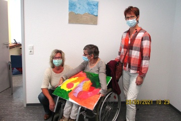 Neuwied. Die farbenfrohen Gemälde wurden von Menschen mit Behinderung aus der Tagesförderstätte des HTZ (Heilpädagogisch-Therapeutischen Zentrum, Neuwied) erstellt. Beim Anblick erfreut man sich über die Wärme und Lebensfreude, die sie ausstrahlen. Eine Künstlerin überreichte die Bilder zusammen mit der Kunsttherapeutin Ziegler.
