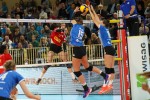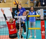 Trotz der schlechten Wettkampfvorbereitung überraschten die Deichstadtvolleys mitgereiste Neuwieder Schaulustige wie 1060 Wiesbadener Fans: Erneut ließen sie erkennen, dass sie auf dem Wege sind, nicht länger Prügelknaben des Oberhauses zu sein. Ein schneller Angriff über Rachel Anderson und ein gutes Service der Amerikanerin zum 2:0 ließen den Weg erkennen: Neuwied verschaffte sich mit präzisen Zielaufschlägen, darauf aufbauend mit gutem Blockspiel und variablen Angriffen Respekt. „Im ersten Satz konnten wir unseren Matchplan durchziehen“, berichtete Dirk Groß an seiner alten Wirkungsstätte. „Aufschlag und Block haben uns einen Punktevorsprung verschafft!“