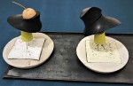 Der zweite Preis geht an eine Keramikerin aus Bendorf: Rita Ternes. Vermutet man zunächst Keramisches, so hat man sich getäuscht, die kleinen Objekte sind eine Mischung aus verschiedenen Materialien; zarte Stoffe führen zu geometrischen Formen, die eine eigene Ästhetik bilden.