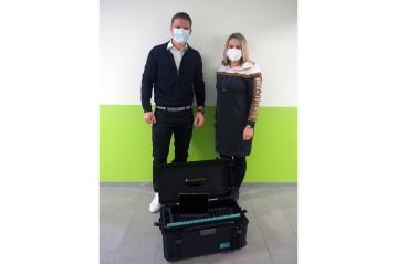 Geschäftsführer Eugen Schäfer übergab der stellvertretenden Schulleiterin Sarina Dümmler kürzlich einen Tabletkoffer zum sicheren Aufladen, Aufbewahren und Transportieren der bereits im Unterricht eingesetzten Tablets. Eine große Erleichterung, denn bislang musste jedes Gerät einzeln geladen werden.