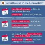 In einem zweiten Schritt wird unter Berücksichtigung der Situation in den Krankenhäusern ab dem 4. März der Zugang zur Gastronomie für Geimpfte, Genesene und Personen mit tagesaktuellem Test ermöglicht (3G-Regelung). Auch Übernachtungsangebote können von Geimpften, Genesenen und Personen mit tagesaktuellem Test wahrgenommen werden (3G-Regelung). Diskotheken und Clubs („Tanzlustbarkeiten“) werden für Genesene und Geimpfte mit tagesaktuellem Test oder mit dritter Impfung (2G-Plus) geöffnet.