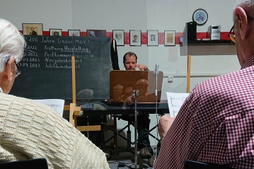 Marco Zimmermann freut sich sehr darüber, dass hier beim MGV eine sehr gute Basis vorhanden ist. Kölsche Tön, da gibt es auch für den neuen Dirigenten kein Vertun, gehören einfach dazu. Aber der ein oder andere bekannte Hit auch aus anderen Sprachen soll möglichst bald dazukommen. Bei der Stimmpflege setzt er aufs Handwerkliche. Da wird auch mal die Tonleiter-Lehre in einer Übungsstunde aufgefrischt und das Notenblatt studiert. Wenn das Handwerk stimmt, dann fällt es auch leichter, neue Partituren zu verstehen und einzuüben.