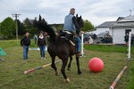 Im Ziel angekommen waren auf einer Parcourswiese weitere Geschicklichkeitsprüfungen zu bestehen wie Balancieren auf Bierkisten, Reiten über eine Plastikplane, Schirmaufspannen auf dem Pferd sitzend und das Pferd so gegen einen Ball dirigieren, dass der Vierbeiner den Ball in ein Tor schießt.