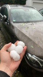 Kreis Neuwied. Innerhalb kurzer Zeit durchquerten zwei Gewitterzellen ab 16.50 Uhr die Region. In der ersten Gewitterfront waren die Dienstgebiete der Polizei Neuwied im Wesentlichen durch extremen Hagel betroffen. Es wurde von Hagelkörnern mit einem Durchmesser von rund 5 Zentimetern berichtet. Mehrere Dutzend PKW wurden dadurch erheblich beschädigt, teilweise wurden während der Fahrt Scheiben zertrümmert. Darüber hinaus wurden eine Vielzahl von Dachfenstern beschädigt, was teilweise auch Wasserschäden in den Gebäuden nach sich zog. Zeitweise war die B 9 im Bereich Andernach Süd durch die Masse der Hagelkörner nicht mehr befahrbar.