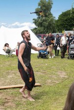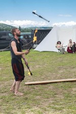 Gabriel, der Feuerteufel unterhielt sein überwiegend jugendliches Publikum mit heißen Nummern und coolen Sprüchen. Er zeigte den total gefährlichen Trick mit einer Bierbank, die er auf seinem Kinn abstellte, jonglierte mit drei Fackeln und einem Feuerstab und bildete einen Schmetterling mit seinen Feuerketten. Die Zuschauer waren voller Bewunderung und Lachen.