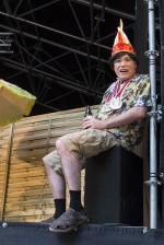 Um auf Augenhöhe mit seinen Zuhörern zu sein, rollte sich Rainer von der hohen Bühne und hatte nach dem Interview das Problem, dort wieder hinauf zu kommen. Mit einem Stuhl und klappernden Orden schaffte er es.