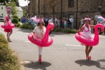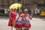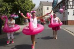Farbenprächtige Fußgruppen schmetterten den Zuschauern auf den Schattenplätzen gut gelaunt „Mäschd helau!“ entgegen. Man sah regenbogenbunte Tütüs, rosa Flamingos, Rockn‘ Roll-Fans, Gärtnerinnen, sonnige Regenwölkchen, Stadtsoldaten, Fußballer und andere fantasievolle Gruppierungen. Zahlenmäßig stark vertreten waren die niedlichen Gardistinnen der heimischen blau-weißen Cometen. Die Stimmung an der Strecke war gut und sowohl die Zugteilnehmer, als auch die Zuschauer hatten ihren Spaß und jubelten sich gegenseitig zu.