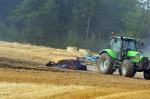 Eine besondere Unterstützung leisteten die örtlichen Landwirte. Mit vielen Traktoren wurde das Brandgut auseinandergezogen und untergepflügt. Ferner wurde zur Unterstützung ein Güllefass mit mehreren 1000 Litern Wasser eingesetzt. Die Feuerwehren stellten die Wasserversorgung durch den sogenannten Pendelverkehr sicher. An einem Fahrzeug war ein 3.000 Liter fassender Faltbehälter aufgebaut, um die Wasserversorgung sicherstellen zu können. Weitere Großtanklöschfahrzeuge standen in Bereitschaft, um aus unterschiedlichen Richtungen eingreifen zu können. Während des Einsatzes, der aufgrund der Witterung sehr kräftezehrend war, stand ein Team des Deutschen Roten Kreuzes an der Einsatzstelle bereit. Nach rund einer Stunde war das Feuer gelöscht und der gesamte Bereich wurde durch Landwirte mit Traktoren umgepflügt. Anschließend wurde das Feld großflächig bewässert, sodass alle Glutnester gelöscht waren.