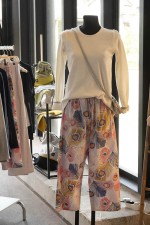Eine Besonderheit waren folkloristisch anmutende Oberteile, die aus alten Paradekissen, Tischdecken und Bauernkitteln recycelt und sehr schick gestaltet worden waren. Der Ehemann der Veranstalterin Astrid Hackenbeck stellte als Benefiz-Aktion Kinderkleidung vor, die in Südafrika von drei Frauen aus afrikanischen Stoffen auf mechanischen Nähmaschinen genäht und gesmokt werden.