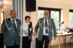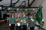 Nach einer Mittagspause wurde es dann richtig spannend. Bei den Erwachsenen zeichnete sich eine größere Anzahl Bewerber um die Königswürde ab. Zunächst wurden aber die Preise geschossen. Die Krone sicherte sich mit dem 19. Schuss Patrick Schmidt. Das Zepter ging mit dem 42. Schuss an seine Ehefrau Alexandra Schmidt-Flatt. Den Reichsapfel holte sich mit dem 50. Schuss Rowena Bender. Angelina Hoffmann errang, mit dem 82. Schuss, die rechte Schwinge. Die linke Schwinge fiel nach dem 120. Schuss an Lars Hoffmann. Björn Hoffmann konnte sich nach dem 150. Schuss über den Stoß freuen. Damit standen die Thronpaare bereits fest.
