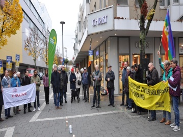 Neuwied. In Neuwied schlossen sich EIRENE, Amnesty International und der Ortsverband von Bündnis 90/den Grünen dem Aufruf an, wobei sich weitere Organisation und Sympathisanten mit den Initiatoren solidarisch erklärten. Elisabeth Freise von den Grünen sprach die Ukrainerinnen und Ukrainer in Neuwied an: "Wir teilen euren Schmerz und fordern von unseren Politikern, dass sie sich für Verhandlungen um einen Waffenstillstand einsetzen, der zunächst mal das Töten beendet und eine Perspektive für einen gerechten Frieden schaffen kann ." Die öffentliche Diskussion um eine atomare Eskalation sei aus ihrer Sicht von erschreckender Lässigkeit geprägt, wobei sie auf den Atomwaffenstandort in Büchel verwies, der gerade mal 40 Km Luftlinie von Neuwied entfernt ist und im Fadenkreuz eines möglichen atomaren Angriffs liegt.