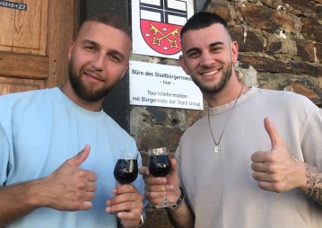 auch im Historischen Rathaus Unkel machte sich das Duo "Dschungelkönig" Filip Pavlovic und Podcaster Serkan Yavuz an die Arbeit: Darauf ein Prosit mit dem "Unkeler Funkeler!" Foto: