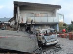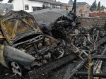 Fotos können kaum wiedergeben, welche verheerenden Schäden das Feuer angerichtet hat. Vor dem Haus an der Garageneinfahrt, wo sich ursprünglich der abgebrannte Carport befand, stehen zwei ausgebrannte Autowracks. Von dem Gebälk sind nur noch verkohlte Reste zu sehen. An der linken Seite des Hauses, wo unter einer etwa acht Meter langen Überdachung Brennholz und Briketts gestapelt waren, befindet sich nur noch Asche und Schutt. Die gesamte Seitenfassade des Hauses ist total verkohlt, die enorme Hitzeentwicklung hat sogar in dem massiven Mauerwerk Risse verursacht. Das Dach wurde an der Feuerseite stark in Mitleidenschaft gezogen und weist enorme Beschädigungen auf. Das ist der erste äußere Eindruck von dem Brandherd.