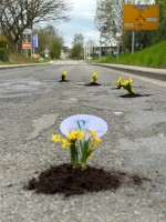 Puderbach. Was war denn da plötzlich auf den Straßen der Verbandsgemeinde los? Überall blühten mitten auf der Straße schöne Blumen und als Blumentöpfe dienten die Schlaglöcher. Der Gewerbeverein Puderbach hatte sich entschieden, mit dieser Aktion auf die Missstände aufmerksam zu machen. Denn der Zustand der Straßen in der Verbandsgemeinde Puderbach lässt - gelinde gesagt - sehr zu wünschen übrig. Von Tag zu Tag reißen in den Straßen der Ortschaften mehr und größere Löcher auf und es ist keine Besserung in Sicht. Die Schilder mit dem Hinweis "Straßenschäden" stehen inzwischen fast überall, aber leider ist es im normalen Durchgangsverkehr überhaupt nicht möglich, den riesigen Schlaglöchern auszuweichen, ohne in den Gegenverkehr zu geraten oder andere Verkehrsteilnehmer zu gefährden.