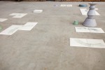 Nach den sich ändernden Lichtverhältnissen im Bogen auf dem Hallenboden arrangiert sind Eleni Wittbrodts Zeichnungen, sie spielen mit der Wahrnehmung und Zeitlichkeit.