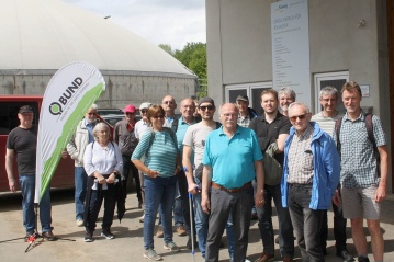 Der BUND freut sich darum besonders über Initiativen, die schon früh und weitsichtig für den Klimaschutz aktiv geworden sind. Dazu gehört zum Beispiel der Verein zur Förderung der Erneuerbaren Energien VFE Anhausen-Meinborn. Der Vorsitzende Clemens Pryss beschrieb die Geschichte des Vereins bei der Besichtigung der genossenschaftlich mitfinanzierten Biogasanlage durch den BUND unter anderem so: "Nach den aufrüttelnden Berichten des Weltklimarates IPCC wurde unser Verein im Jahre 2007 gegründet. Wir sind Initiator für die Biogasanlage, nach vielen Überlegungen und Analysen, was hier vor Ort möglich wäre. Nach Besichtigungen kamen schließlich die Ortsgemeinden und die Süwag Erneuerbare Energien und Wasser mit ins Boot, eine Genossenschaft wurde gegründet. Daneben gab es Infoveranstaltungen zum Energiesparen, Fotovoltaik oder "Sonnenfeste". Sobald das notwendige Kapital beisammen war, begann der Bau und die erste Inbetriebnahme 2012 der Biogasanlage und nach einer größeren Reparatur das Wiederanfahren 2014. Heute läuft die Anlage insgesamt gesehen gut. Der Generator hat eine Leistung von 635 kW. Dabei stehen noch 675 kW Wärme zur Verfügung, genutzt für die Beheizung der Fermenter und die Klärschlammtrocknung. Durch die Stromerzeugung werden bei 8300 jährlichen Volllaststunden 6,6 MW ins Netz eingespeist, mit wenig Abwärme und ohne atomaren Müll zu hinterlassen wie bei den Großkraftwerken. Die Verbindung von Strom- und Wärmeerzeugung zeigt so gegenüber herkömmlichen fossilen Verbrennungstechniken große Vorteile in der Effizienz und schont damit das Klima."