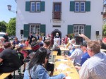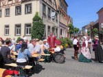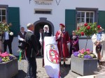 Im Nachtrag zu diesem unterhaltsamen Historienspiel am Historischen Rathaus hatte "Schultheiß" Bernd Wolf noch ein eher unangenehmes Ritual zu erledigen, wobei er darauf verwies, dass amtlicherseits jegliches volkstümliches Zusammensein im Schloss künftig nicht mehr stattfinden soll. Stattdessen sollen "feine Pinkel" das Schloss mit Musik bevölkern und somit das Schloss für die Bürgerschaft verschlossen bleiben. Und der "Teilschlossherr" und "Obermusikant" Rolf Ehlers trägt offendig Mitschuld daran, dass dies so geschehen soll. "Dies muss geahndet werden", betonte der Schultheiß aufgeregt und so legte man dem unglücklichen "Missetäter" die "Schandgeige" an. Doch der Hofmann relativierte die Schuld des musikalischen "Teilschlossherrn" und betonte, dass Rolf Ehlers keine Schuld treffe, da er sich doch unbedingt immer für die Engerser Belange einsetze. Und so wurde ihm die leidige "Schandgeige" wieder abgenommen. Allerdings: Falls er nicht ein bekanntes Engerser Lied beim bevorstehenden Festakt zur 1250-Jahr-Feier im September singe, dann wird er dieses ungebührliche Verhalten im Duckesje bei Wasser und Brot büßen müssen, betonte der "Schultheiß".