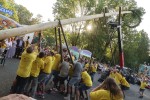 Nach einer Stärkung ging es gemeinsam auf den nahen Kirmesplatz. Dort angekommen, wurde der Baum mit Muskelkraft aufgestellt. Als Sicherheitsauflage war in diesem Jahr ein Teleskoplader mit angebautem Gabelstapler dabei, der das Aufstellen absicherte. Außer der Kirmesgesellschaft waren viele Zuschauer gekommen, um das Spektakel zu verfolgen. Wie immer gab Jürgen Dills die technischen Anweisungen. So gelang es den Dierdorfern wieder einmal, unfallfrei ihren Kirmesbaum samt Kranz in die Höhe zu hieven.