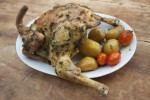 Die Rosmarinzweige entnehmen und das Brathähnchen zusammen mit den Kartoffeln servieren. Den Saft, der in der Fettpfanne zusammenläuft, in einer Sauciere zu Kartoffeln und Hähnchenteilen reichen.
