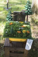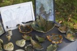 Neben Karten mit philosophischen Texten und Gedichtbänden präsentierte der Autor Hans-Werner Lücker seinen neuen Roman "Tatort Lehrerzimmer". Zwischen den Bäumen stellte Viktor Brikmann akribisch detailgenau gemalte Häuser und Bäume aus. Auch Alexander Pavlyk arbeitete seine gegenständlichen Motive mit Stiften und Aquarellfarben präzise aus. Im Kontrast dazu stand die "Fundkunst" von Erlenwohl, lustige Objekte, die aus Schrott und Alltagsgegenständen kombiniert waren. Pfiffig doppeldeutig bildete ein rostiges Türschloss auf Plastikrasen mit Blümchen ein herrschaftliches Gebäude.