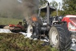 Die Flammen waren schnell im Griff, aber der große Traktor war nicht mehr zu retten. Auch eines der beiden Mähwerke wurde stark in Mitleidenschaft gezogen. Der DRK-Ortsverein Puderbach löste den mitalarmierten Regelrettungsdienst ab und stellte den Schutz der Feuerwehrkameraden sicher. Ein Eingreifen war von deren Seite zum Glück nicht erforderlich.