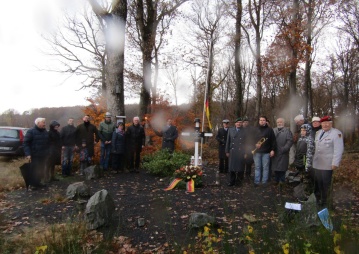 Steimel. Unter der Leitung von Stabsfeldwebel der Reserve Klaus Grollius, Vorsitzender der Reservistenkameradschaft Dreisbacher Land, wurde am Sonntag (19. November) die Gedenkveranstaltung am Fliegerkreuz im Steimeler Wald abgehalten. Der Ort ist bekannt als Absturzstelle des Piloten Feldwebel Johannes Kellner, der dort am 23. Dezember 1944 mit seiner Messerschmidt Me109 G6 den Fliegertod fand. Trotz ungünstiger Wetterbedingungen gedachte Grollius in seiner Ansprache nicht nur den gefallenen Soldaten und Zivilopfern, sondern auch allen Vertriebenen und Verfolgten aufgrund ihrer Rasse, Hautfarbe oder Gebrechen. Ebenso gedachte er all jener, die ihr Leben lassen mussten.