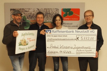 Am Donnerstag, dem 14. Dezember reisten der Vorsitzende der Big Band, Thomas Kaballo und der Vorsitzende des Gesangvereins Thalhausen, Friedhelm Kurz, mit dem Dirigenten Wolfgang Fink nach Koblenz. Dort übergaben sie insgesamt 6.500 Euro an Katja Masendorf vom Ambulanten Kinder- und Jugendhospiz. Der Betrag setzt sich zusammen aus 5.332 Euro aus dem Konzerterlös plus 1.168 Euro aus den Spendendosen, die an den Konzerttagen aufgestellt waren. woti