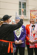 Neuwied. Mit leuchtenden Augen und in schillernden Kostümen, die dank des milden Wetters nicht einmal von Jacken verdeckt werden mussten, warteten zahlreiche Schaulustige am Vormittag des 10. Februars gespannt auf das alljährliche Spektakel, welches sich aus der Ferne schon mit den Klängen des Musketiercorps Neuwied ankündigte. In Begleitung der musikalischen Unterstützung marschierten die närrischen Truppen, bestehend aus den „Streitkräften“ diverser heimischer Karnevalsgruppen, auf den Rathausplatz und positionierten sich. Ihr Ziel: Oberbürgermeister Jan Einig in Ketten legen, den Rathausschlüssel überreicht bekommen und somit die altbekannte Ordnung in der Karnevalszeit außer Kraft zu setzen.