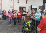 Zurück von Amsterdam wurde die Fahrradgruppe in Andernach empfangen vom Team des Weltladen Andernach zusammen mit dem Andernacher Bürgermeister Claus Peitz, dem Leiter der örtlichen Sparkasse sowie Vertretern der Weltläden aus Koblenz, Linz, Mayen, Neuwied, Remagen und Vallendar.