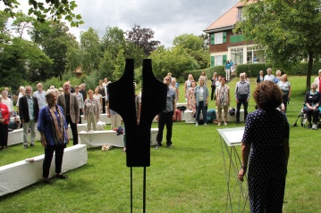 Zu dem Geburtstagsfest waren fast 100 Menschen gekommen. Über diesen vielzähligen Ausdruck der Verbundenheit ist Vorsitzende Dagmar Auberg besonders beglückt. Nach einer Andacht im Garten überbrachte Kirchenrat Eckart Schwab die Gratulation von Präses Dr. Thorsten Latzel: "Es ist wichtig, dass es Orte gibt, die uns an die heilsame Kraft der Stille erinnern und an denen wir das Hören auf Gott einüben können. Vielen Dank, dass Sie diesen Ort für andere bewahren und die Menschen hier so herzlich empfangen und begleiten." Sich über spirituelle Lebenswege auszutauschen und Gemeinschaft zu teilen liegt den FFK-Mitgliedern am Herzen: So war der Nachmittag erfüllt von gemeinsamem Singen, am Piano begleitet von Maria Petker, Gesprächen bei sommerlichen Köstlichkeiten und - als Höhepunkt - von Bühnen-Interviews mit vier Personen, die dem FFK vor Kurzem, vor Langem und als Paar beigetreten sind. Ob neue Berufswahl oder anderer Lebensstil: Sie erzählten auf berührende Art, wie die Stille im Haus der Stille ihr Leben so verändert hat, dass sie diese auch anderen Menschen ermöglichen möchten. Insgesamt zählt der von 21 Personen gegründete Verein inzwischen 380 auf ganz Deutschland verteilte Mitglieder. Sie unterstützen das Haus der Stille jedes Jahr mit mehreren Zehntausend Euro.