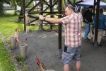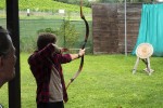 Die bei den Besuchern beliebteste Disziplin war das Historische Bogenschießen. Dafür standen verschiedene Nachbauten aus Holz, Fischleim, Horn und Sehnen zur Verfügung. Experte für Bogenschießen ist Frank Wiesenberg. Er favorisiert Nachbauten historischer Reiterbögen aus Ungarn und Holzbögen aus Eifel-Eibe. Der Geschäftsführer gab Tipps für das richtige Anlegen von Pfeil und Bogen, trotzdem bedurfte es einiger Übung, bis der Pfeil überhaupt die Zielscheibe berührte.