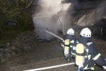 Parallel wurde eine Wasserversorgung von dem mehrere hundert Meter entfernten Hydranten an der Landesstraße 267/Abzweig nach Hanroth aufgebaut, damit genügend Wasser zur Verfügung stand. In der Garage befanden sich mehrere Motorräder und Werkzeuge. Sorge bereitete zunächst die Information, dass sich eine Gasflasche in der Garage befindet. Die umliegenden Anwohner, die zur Einsatzstelle kamen, wurden gebeten großen Abstand zu halten. Der Bereich, wo die Gasflasche stand, wurde besonders mit Wasser gekühlt. Die Flasche konnte im Laufe des Einsatzes geborgen und weiter gekühlt werden. Sie richtete keinen Schaden an.