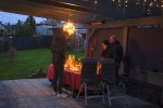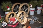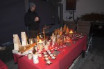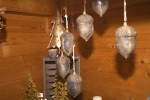 Im Garten zog ein großer Leuchtstern auf dem Rasen die Blicke auf sich. Die gemütlich-heimelige Gartenhütte war dank eines Kaminofens ein sehr angenehmer Ausstellungsort. Sterne in allen Variationen sind der diesjährige Renner. Überdimensionale Eicheln hingen als neue Deko-Objekte von der Decke. Zahlreiche Lämpchen und Kerzen verliehen dem Ambiente eine festliche Stimmung. Aufgrund der nasskalten Witterung drängten die Besucher mit Würstchen, Glühwein, Kinderpunsch oder Waffeln an den als Tannenbäume gestalteten Tischen mit Heizpilz.