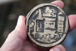 Vor dem Eingang hat Volker Allexi seine Werkstatt aufgebaut: Rechteckige Gießformen füllt er mit ölgebundenem Quarzsand, der eine so feine Körnung aufweist, dass auch ganz feine Strukturen abgebildet werden. Der Sand muss temperaturbeständig und bildbar sein. Zuerst wird Sand in die Form gesiebt und mit den Fingern angedrückt, diese erste Sandschicht wird später oben sein. Die dickere, nächste Schicht wird mit dem Stampfer festgedrückt. Dann dreht der Metallkünstler die gefüllte Form um und bepinselt die glatte Oberseite mit Talkumpuder, bevor er zwei Stempel einschlägt. Zum Schluss wird noch einmal gepudert, damit sich das Metall später löst.