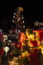 Ein langer Menschenzug zog zur Weihnachtspyramide an der Kirchtreppe, die 1997 als erstes Weihnachtssymbol aufgestellt wurde. Da die Kinder sich an Weihnachten am meisten auf die Geschenke freuen, wurde erst einmal ein großer Geschenkestapel um den Wunschbrunnen illuminiert, bevor die Kerzen an der großen Weihnachtspyramide mit Drehelementen leuchteten. Kesselheim erläuterte, dass die acht Meter hohe Pyramide nach den Plänen der Pyramiden erbaut wurde, die zum ersten Mal im Erzgebirge kreiert und in die Häuser gebracht worden waren. Vier große Figuren aus dem Erzgebirge flankieren die Kirchtreppe selbst.