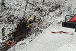 Der Pkw kam auf der Fahrerseite liegend in einem Bach zum Stillstand. Glücklicherweise konnten die Insassen das Fahrzeug selbstständig verlassen und einen Notruf absetzen. Die alarmierten Rettungskräfte hatten aufgrund der schneereichen Bedingungen Schwierigkeiten, zur Unfallstelle zu gelangen.