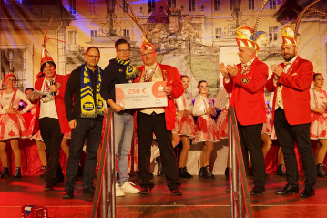 Irlich. Gemeinsam mit den Funky & Magic Diamonds besuchte eine Vorstandsdelegation der TSG Irlich die Benefiz-Sitzung im Heimathaus. Der Erlös dieser Veranstaltung kommt allen Vereinen zugute, die vom Brand des Lokschuppens betroffen sind. In der Silvesternacht fiel der Lokschuppen den Flammen zum Opfer, wodurch unter anderem fast fertiggestellte Karnevalswagen und Bühnenbilder zerstört wurden.