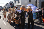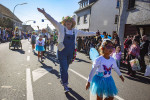 Kleinmaischeid. Der Zug kam nur sehr langsam voran, weil unzählige Besucher mit eifrig Kamellen sammelnden Kindern an der Strecke standen. Die vielen wunderschön gestalteten Fußgruppen und besonders die Mottowagen wurden von heranlaufenden Menschen ausgebremst. Die Ordner neben den Zugmaschinen hatten eine verantwortungsvolle Aufgabe, die sie zuverlässig erledigten. So zog der Festzug unfallfrei zweimal durch den Ort bis zur Narrhalla, dem Bürgerhaus.