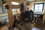 Der neu gestaltete "Bibelraum" im verwinkelten Anwesen in der Hauptstraße 22 in 56316 Niederhofen bietet das passende Ambiente für die zwei Meter hohe Druckpresse aus Eiche: Vom Fußboden mit alten Keramikfliesen und Holzbohlen bis zur Balkendecke und gotischen Keramikkrügen aus dem Siegburger Raum auf Regal und Fensterbank bildet er ein stimmiges Gesamtkunstwerk. Den Fuß der Druckpresse ziert ein um 1600 modellierter Atlas, der den ganzen Druck der Welt auf seiner Schulter trägt.
