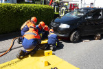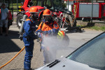 Am Sonntagnachmittag zeigte die Jugendfeuerwehr, was sie gelernt hat. Simuliert wurde ein Unfall am Zebrastreifen. Ein Fahrzeug hatte einen Fußgänger angefahren, der unter dem Pkw eingeklemmt war. Ein zweites Fahrzeug war aufgefahren und fing an zu brennen. Mit zwei Trupps ging der Nachwuchs ans Werk. Das eine Fahrzeug wurde gelöscht. Die Person, simuliert durch eine Puppe, konnte nach Anheben des Pkw befreit und dem Rettungsdienst übergeben werden. Weit über 100 Zuschauer verfolgten die Übung und spendeten großen Applaus.