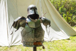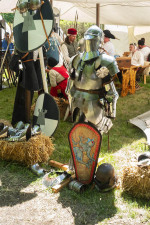 Puderbach. Es wurde eine ganze Menge geboten unterhalb und in der Burganlage. Gleich am Eingang war ein mittelalterliches Söldnerlager wie im 13. Jahrhundert mit Waffenschau, Rüstungsausstellung vom Kettenhemd bis zu Schild und Banner ein Blickfang. Die Soldaten erklärten gern die Funktionen ihrer teils martialisch wirkenden Ausstattung und boten um 13 Uhr eine Rüstschau ihrer "Uniform". Haushaltszubehör aus Holz wie gedrechselte Teller, Löffel und Schalen gehörten zum Tross. Ein Keramik-Krug in Tierform entpuppte sich als mittelalterlicher Wasserhahn, genannt "Aquamanik".