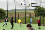 Der Fahrradparcours wird schon rege genutzt, es gibt ein Spielfeld mit Kunststoffbelag und Basketballkörben und ein Volleyballfeld, das etwas unter der Trockenheit gelitten hat, eine Boulebahn, eine Naturtribüne und Sitzgruppen. Der Außenbereich ist noch in Planung, er wird, als Klimaschutzmaßnahme konzipiert, ebenfalls zu hundert Prozent gefördert werden.